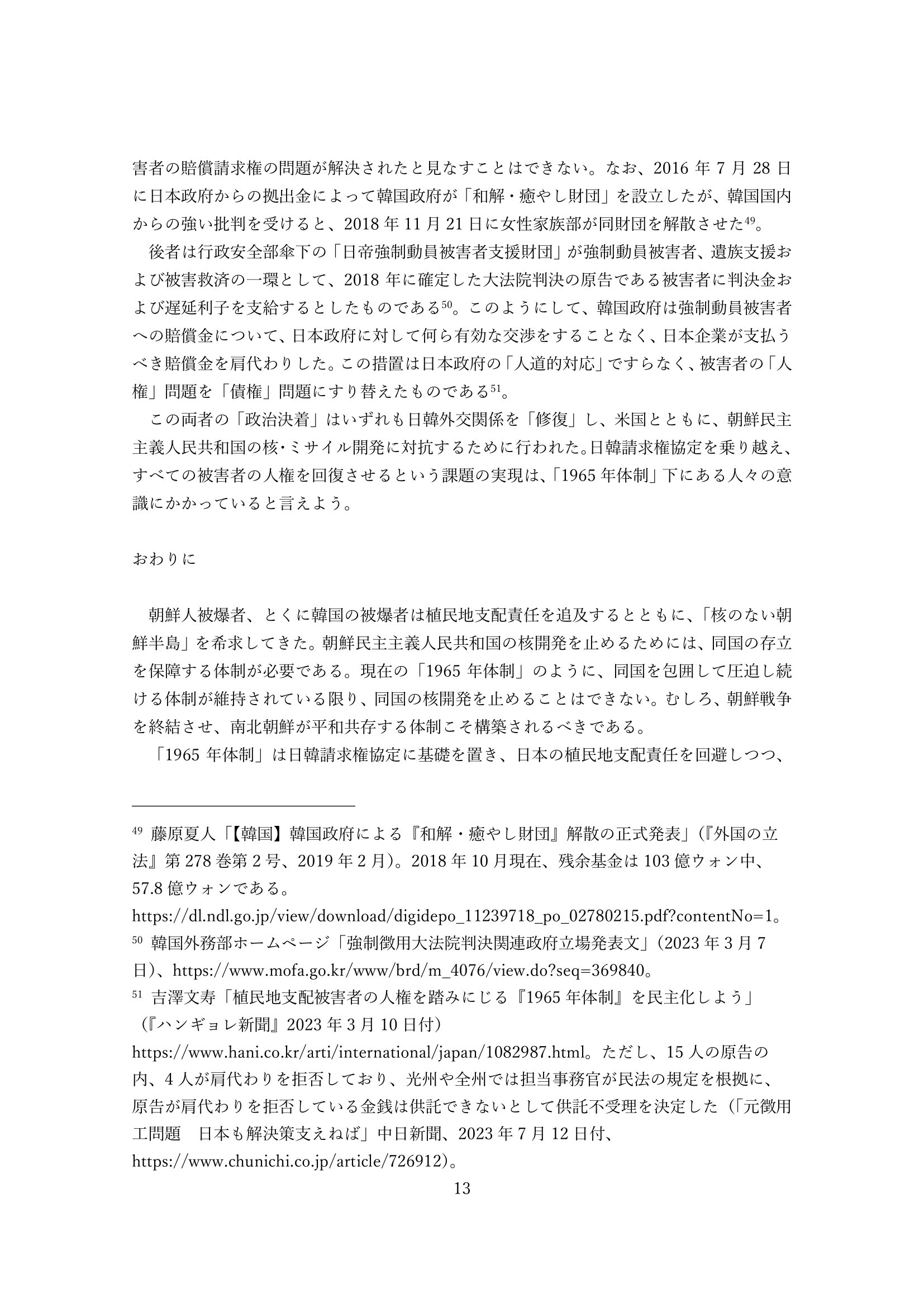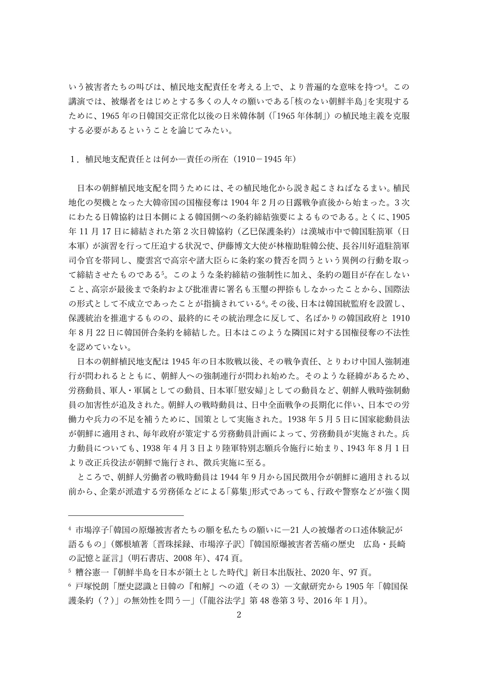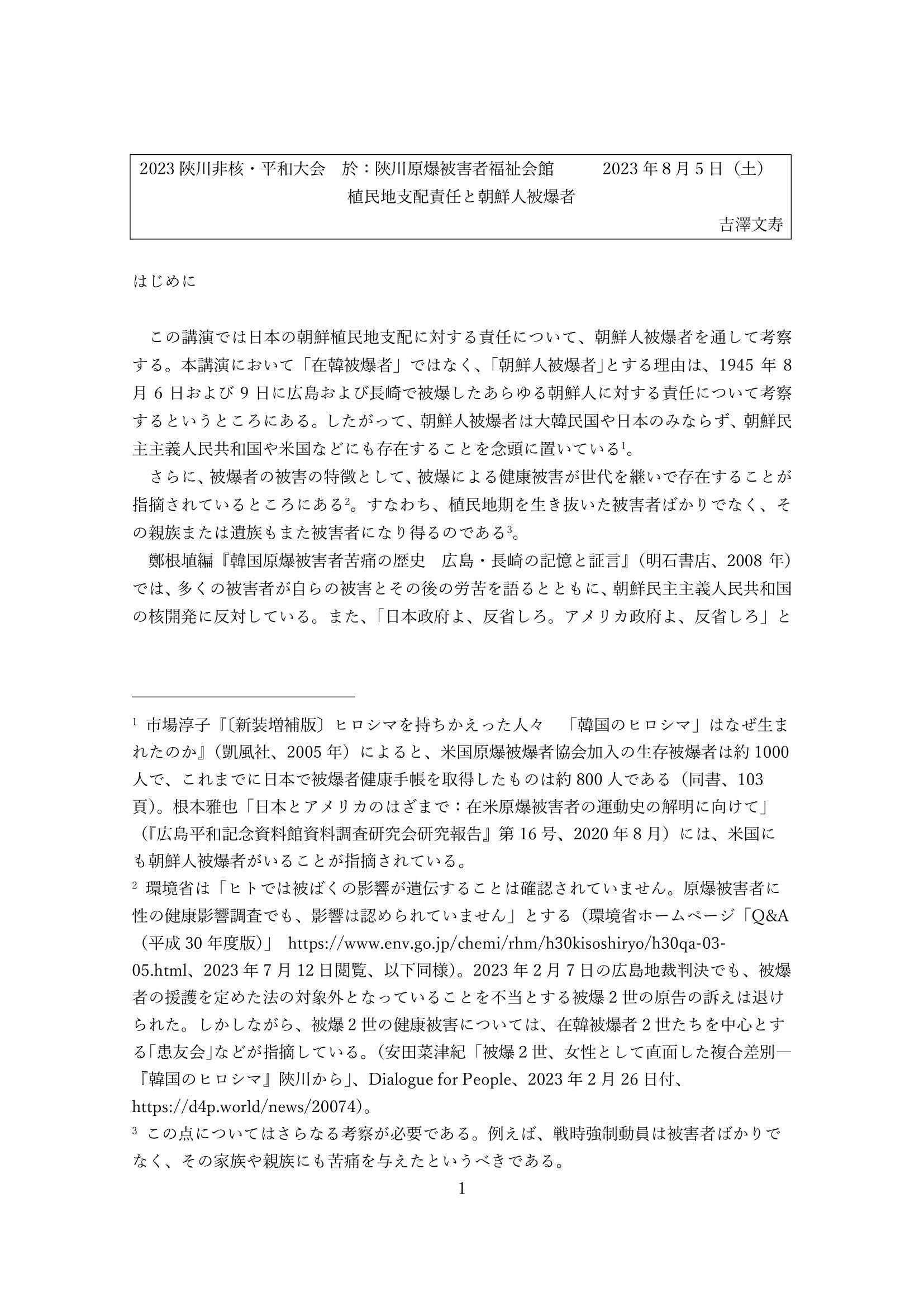 植民地支配責任と朝鮮人被爆者 講演者:吉澤文寿(新潟国際情報大学教授) 2023年8月5日(土)午後、韓国の陜川(ハプチョン)原爆被害者福祉会館で開催された『2023陜川非核・平和大会』にてシンポジウムでメインスピーカーとして講演された発表文です。